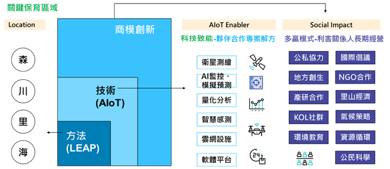AIoT技術協助企業打造智慧生活,透過公私協力及公民科學(Citizen Science)倡議,創建開放資料生態圈。如台灣生物多樣性網絡即是其中一例,提供逾2,100萬筆數據,覆蓋近3萬種物種,幫助企業進行生態檢核,支持環評與永續行動規劃,加速生態復育進程。