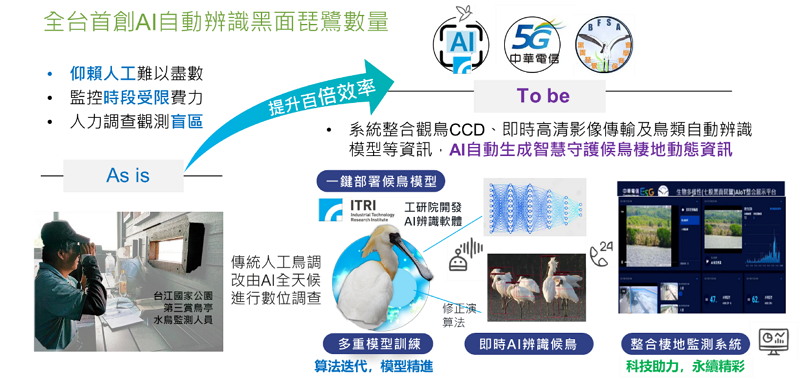 - 濕地候鳥保育:中華電信發布我國電信業第一本TNFD報告書,並與工研院合作全台首創「人工智慧(Artificial Intelligence,AI)自動辨識黑面琵鷺監測系統」(圖2)。以中華電信5G網路,結合工研院開發的AI辨識演算法,以及黑面琵鷺保育協會與台江國家公園提供鳥類照片,訓練AI模型進行黑面琵鷺的辨識,達成高達86.6%的辨識準確率,每張辨識時間約0.4秒,透過持續迭代與多模型精進,實現全天候穩定監控、快速準確辨識瀕危物種黑面琵鷺,解決以往人力難以達成盡數與監測盲區的痛點。此外,更利用AI電子圍籬技術監測巢位周圍環境,快速通報入侵影像,確保黑面琵鷺的棲地安全。