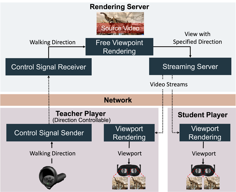 本應用系統整合5G通訊網路、邊緣雲與虛擬實境技術,開發出應用於偏鄉教育領域的高擬真異地沉浸學習應用,通過沉浸式應用服務打破時空界限,使偏鄉學生不再因時間和距離等限制無法參觀博物館與美術館等藝文空間,減少偏鄉文化資源相較於城市匱乏的問題,降低城鄉教育資源落差,提高偏鄉學生多元學習機會。本系統架構如圖4所示,偏鄉老師透過手把控制器移動視角,並透過5G通訊網路將移動資訊傳輸至邊緣雲,應用邊緣雲高運算力與多自由度移動全景畫面渲染技術,渲染出虛擬視角的全景視訊畫面,再透過5G通訊網路同時將畫面傳輸至所有頭戴式裝置與教室電腦上,頭戴式裝置藉由高解析度全景畫面渲染技術顯示8K解析度的高畫質影像。