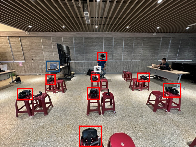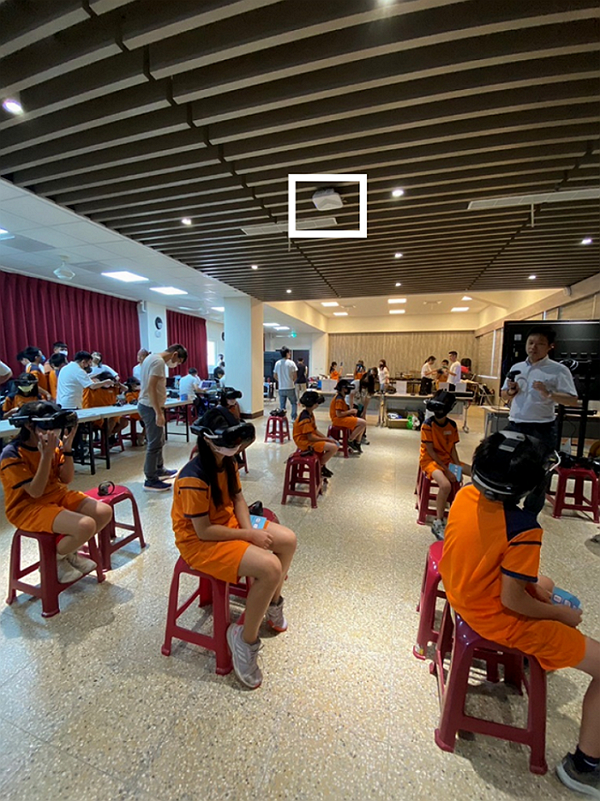 本應用分別於兩間不同偏鄉小學場域部屬高擬真異地沉浸學習應用系統(如圖4),其中Network使用5G專網,讓超過50位學生實際體驗兩堂古今台灣系列課程,如圖5與圖6所示,場域內部署八台VR頭戴裝置(圖5中紅框)、一個自由視角移動控制器(圖5中白框)、一台教室電腦(圖5中籃框)與5G RU設備(圖6中白框),測試結果顯示平均自由視角全景畫面渲染速度達30.9FPS,綜合評估結果超過90%的學生對於課程內容安排覺得滿意。