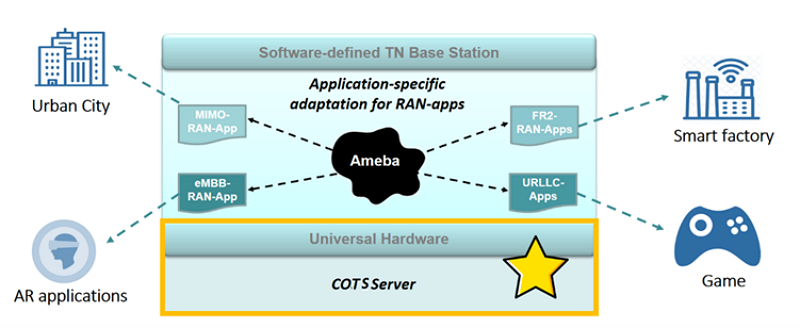 衛星與5G通用軟體調適基地台技術,結合了兩個重要特點:(1)使用開放的伺服器(Open COTS server);(2)支持衛星通信。使用COTS server使電信運營商在轉向新的通信模式(例如,從提供eMBB服務到FR2或NTN服務)時,無需更換硬體,從而降低了硬體成本。特別是在NTN衛星通信方面,基於3GPP開放標準協定,用戶不需擁有專有接收設備即可通信。