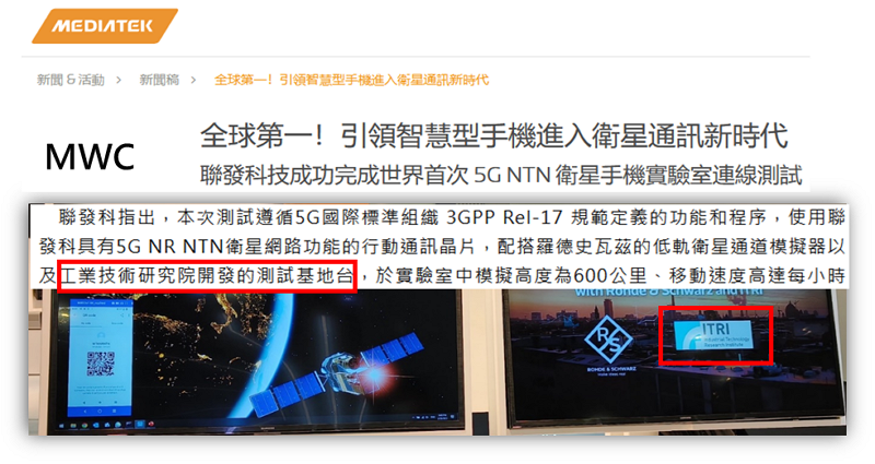 概念驗證分兩部分,第一部分與MTK以及R&S在MTK實驗室完成世界第一個3GPP R17手機驗證。並且驗證在低軌衛星運行下可以進行資料傳輸。第二部分,首次在MWC 2023上展示,代表了全球首個完成端到端語音通話服務的NTN系統。系統同樣聯手MTK共同研發手機直連通訊技術,如圖6所示。ITRI團隊提供測試基地台、MTK提供手機設計。並且吸引許多關鍵廠商的注意,包含SKT電信商、遠傳電信商等。2024年MWC展示與MTK聯手驗證pre-R19概念性驗證,亦獲得BMW的關注。
