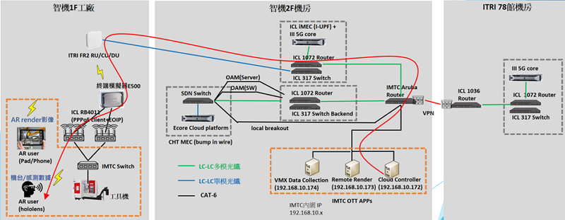 在台中智機場域概念驗證建置架構,如圖7所示。核心網路放置於新竹工研院竹東總部,TN FR2基地台系統放置於台中智基1F機房,並且MEC近端網路資料庫,建置於台中智基2F機房。因此達到低延遲網路串連。而加工機械與AR操作系統則是建置於台中智基1F工廠。工研院TN基地台系統,與法國達梭公司開發的遠端操作系統進行整合,並且成功在台中智機完成遠端操作應用與場域驗證。