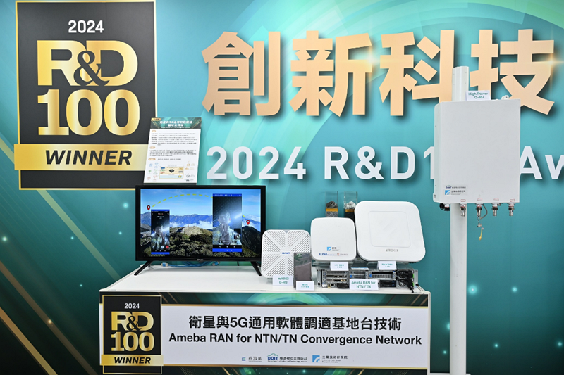 台灣首度完成第一個由軟體定義基地台的TN&NTN網路。其中克服衛星通道高延遲、高頻偏與時變效應,由地面網路升級成非地面網路,打通服務鏈路的建鏈流程,並與MTK、R&S成功完成世界首次5G NTN衛星手機實驗室連線測試,共同展示於MWC、ComputeX、ICT TechDay。另外,攜手聯發科技、中華電信研究所以衛星與5G通用軟體調適基地台技術共同拿下2024年全球百大科技研發獎R&D 100 Awards,如圖8所示。