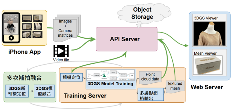 如圖1所示,工具前端介面是一套透過AR輔助拍照建模的手機APP,讓使用者只需拍攝影像即可完成建模。影像數據會自動上傳雲端服務平台進行AI訓練,生成高品質的3D模型。整個過程快速高效,無需昂貴設備或專業技能,並且使用者可以直接在手機端查看建模成果,或透過網頁進行3D模型展示,大幅降低操作門檻。