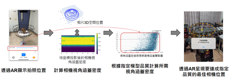 要建出高品質3DGS模型需要有涵蓋所有商品視角的影像,既有3D建模App多透過固定式的AR提示介面引導使用者進行拍照。但這種作法無法根據使用者已經拍照過的資訊進行動態建議,也沒辦法預估建模品質。我們研發了基於相機視角涵蓋密度的拍照提示技術,將拍照位置投影到以物件為中心的球表面上來計算視角涵蓋密度,作為後續最佳拍照位置計算的依據,達成可根據使用者以拍攝的照片動態預測最佳拍攝位置的目的。藉由收集大量測試數據來建構視角涵蓋密度與建模品質關聯模型,讓使用者可以針對需要的模型品質,動態計算出所需的拍照張數與位置。技術流程如圖2所示。
