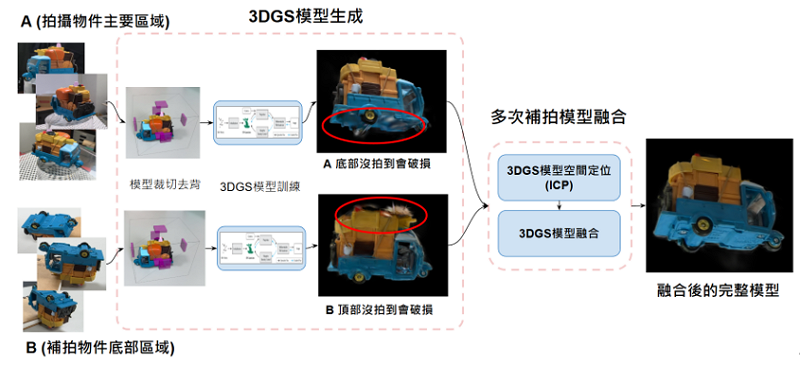既有3DGS建模流程需事先準備好拍攝物件、場景所有照片,再進行一次性3D建模[1]。如果因為拍照缺失導致3D建模品質不良需要重新收集所有照片再進行建模,耗費大量人力與建模時間。資通所開發多次補拍與模型融合技術,解決傳統建模中因成果不理想而需多次重新拍攝和重建模型的問題。技術流程圖如圖3所示,使用者只需針對需要改進的區域進行補拍,再將新數據與現有模型融合,無需重新建模,顯著節省時間與成本。透過迭代最近點演算法(Iterative Closet Point, ICP)[2]來計算多次拍照建模的3DGS模型之間的空間關聯性,藉此進行模型融合。並重新優化重疊區域的模型表面資訊來消除模型缺陷導致的瑕疵。此技術能精細處理細節區域,提高模型的準確性與完整性,使整個建模過程更加靈活高效。