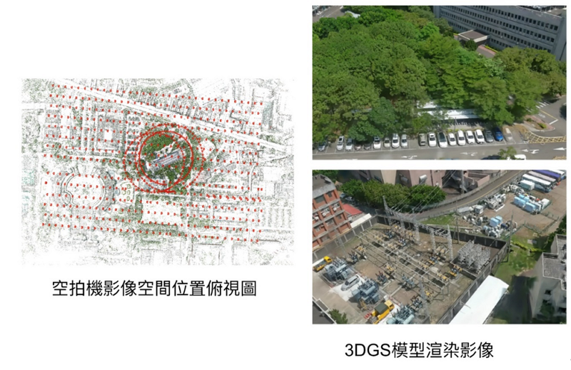 圖4 空拍機工研院中興院區高空拍攝與3DGS場景建模成果展示