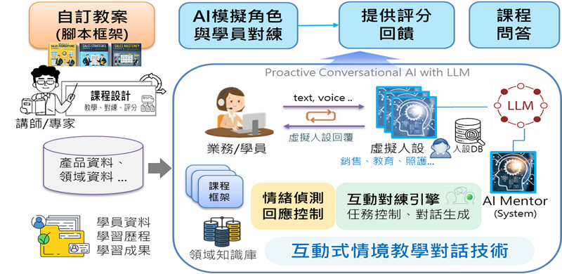 -以LLM驅動之AI代理框架,建構互動教學、模擬對練、評量回饋、課程問答與情緒偵測等核心模組。